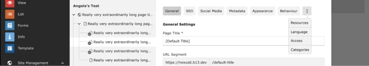 In this overlay all the mandatory fields have to be filled in to create a new page. The different areas of the page properties are displayed in a horizontal navigation above the input area. If there are too many areas to fit into one row, the ones that don’t fit anymore are hidden behind a “more”-icon. In this way users don’t get overwhelmed by too many options. Mandatory fields that haven’t been filled in yet get marked with an exclamation mark next to the corresponding tab.