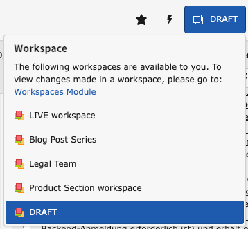 Richte einen einfachen Entwurf-Workspace ein, damit du mit der Eingabe von Inhalten beginnen kannst. Du kannst sogar mit dem Umschalter für Workspaces zwischen verschiedenen Workspaces wechseln. Im Backend befindet sich oben eine entsprechende Markierung, die deutlich macht, dass du in einem Workspace arbeitest.