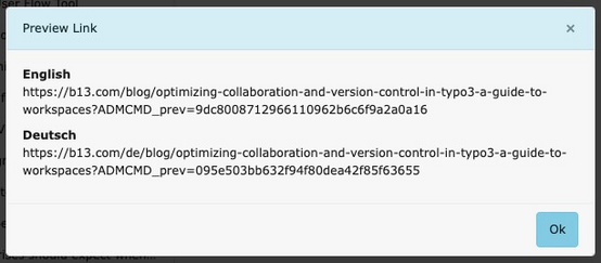 Um Vorschau-Links zu erstellen und mit deinem Team zu teilen, bietet TYPO3 eine „Workspace Preview“-Funktion. Du kannst einen Vorschau-Link für einen bestimmten Arbeitsbereich generieren, der es autorisierten Benutzern ermöglicht, die Inhaltsänderungen in diesem Arbeitsbereich zu sehen, ohne die Live-Website zu beeinflussen.