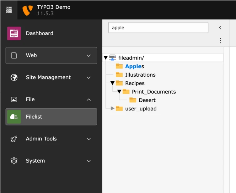 Eine der wichtigsten Funktionen von TYPO3 ist der Page Tree, eine strukturierte Möglichkeit, alle verfügbaren Seiten einer Website auf einen Blick zu sehen. TYPO3s Pendant für die Verwaltung von Dateien und Assets ist der "Folder Tree", den du vielleicht aus dem Windows Explorer oder dem Finder deines Betriebssystems kennst.