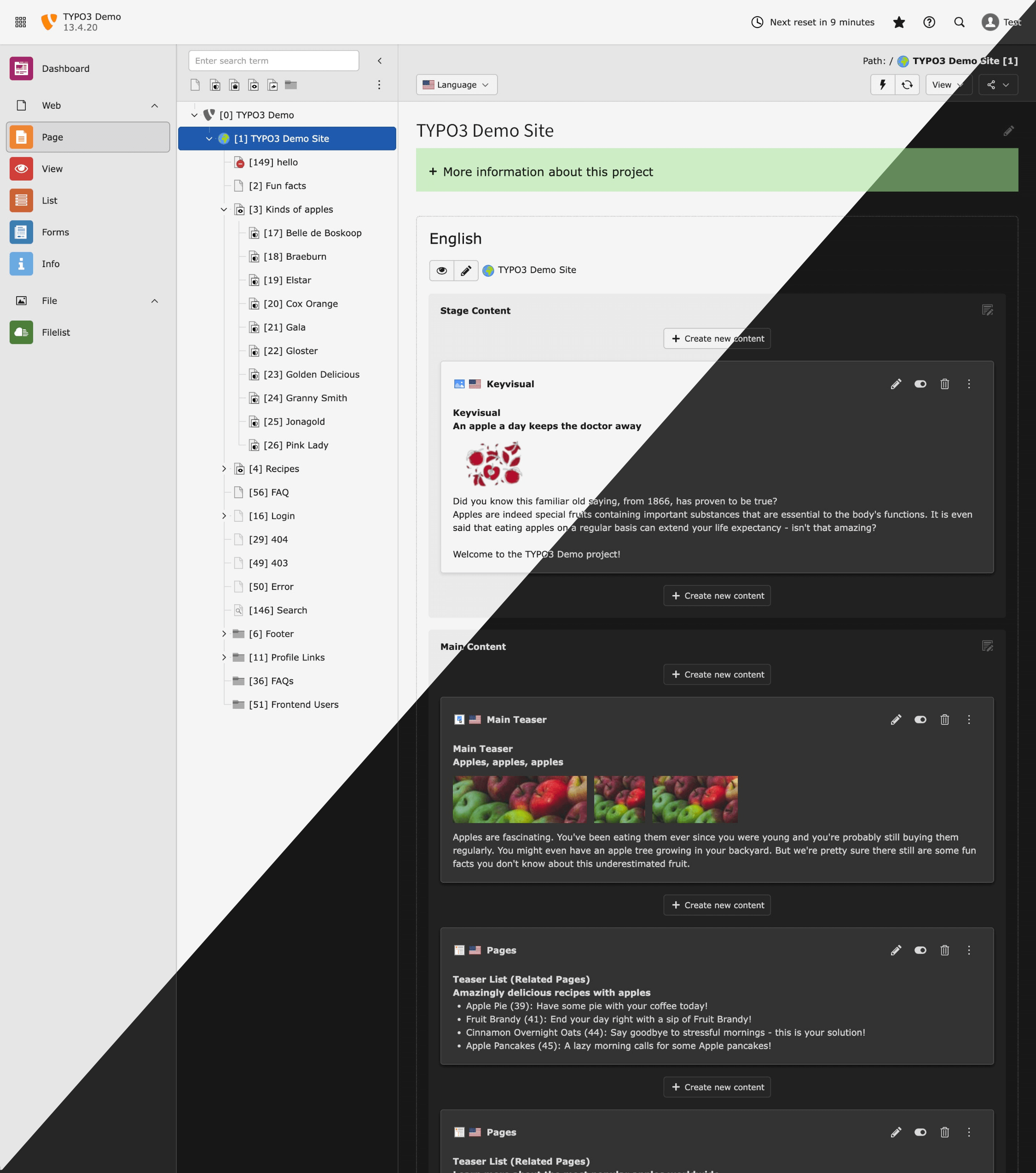 Mit dem neuen Design präsentiert sich v13 moderner, klarer und benutzerfreundlicher als je zuvor. Stärkere Kontraste und eine optimierte Lesbarkeit sorgen dafür, dass Inhalte sofort ins Auge fallen, während das Backend durch das verbesserte Responsive Layout jetzt auf allen Geräten nutzbar ist. Der neue Seitenbaum ist nicht nur performanter, sondern auch für Screenreader und Tastaturnutzung optimiert.